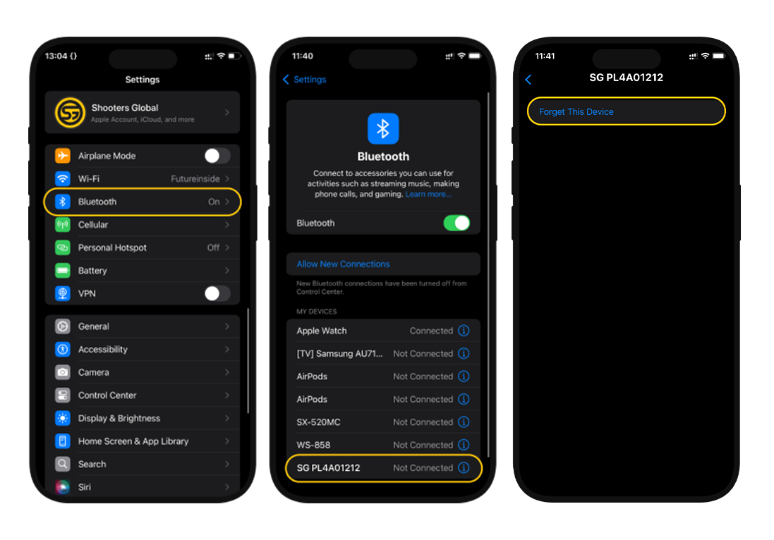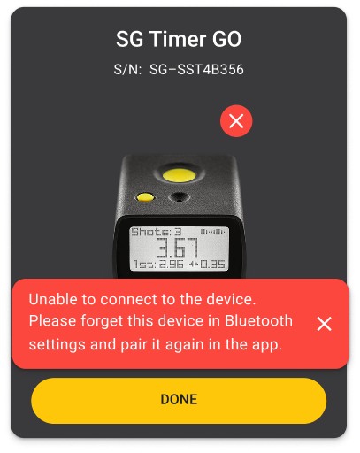 ❗If you cannot connect or see a connection error on any of your device (SG Timer, GO Timer, SG Pulse, Pulse Pro) you must remove the old connection from iOS/Android settings.
